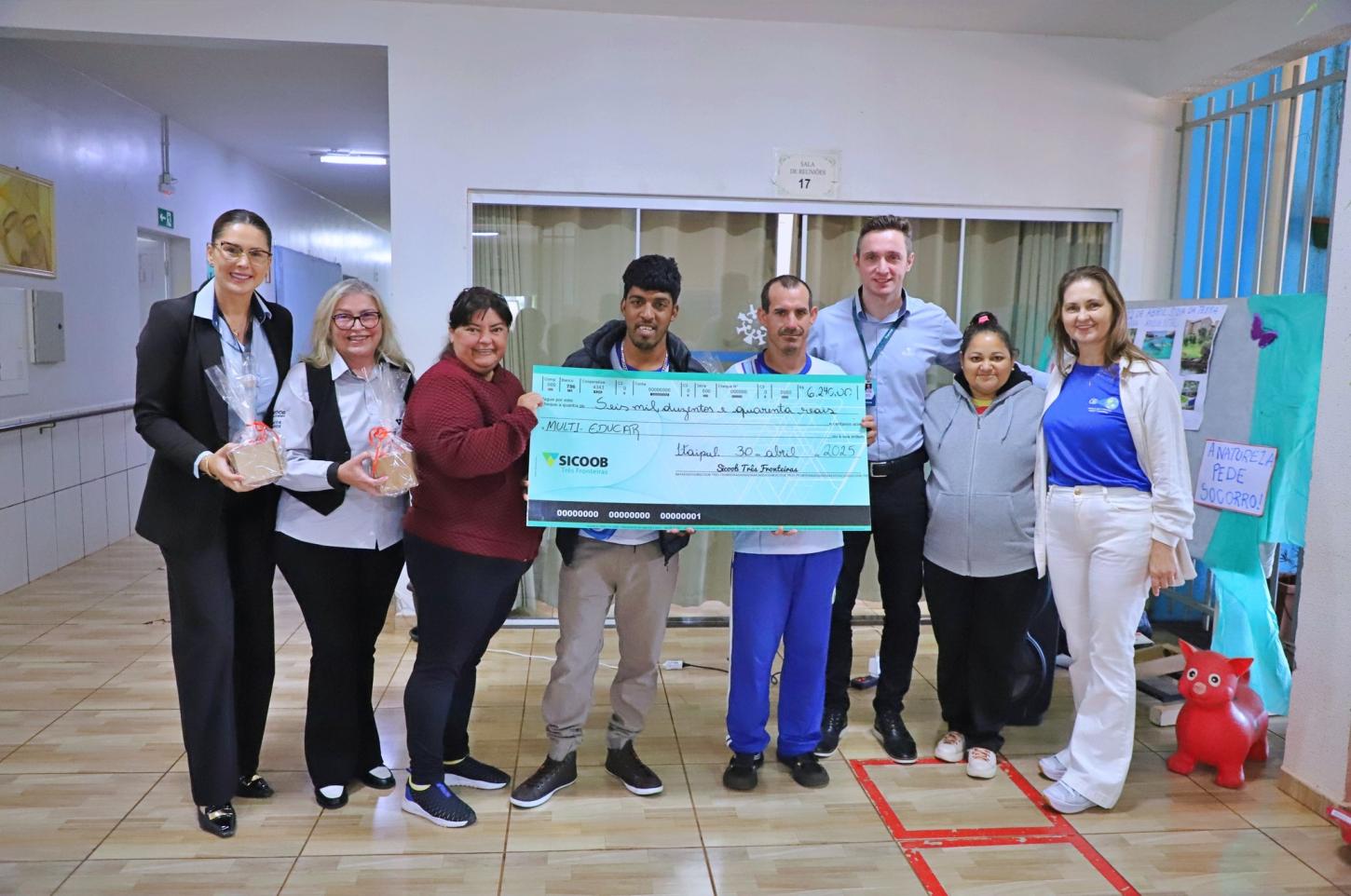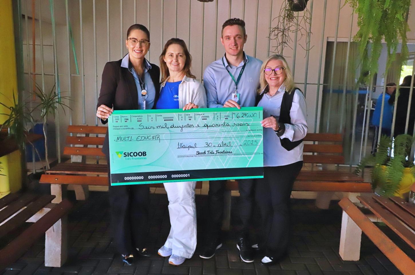 Em uma ação que já se tornou costumeira, o Sicoob repassa R$ 10,00 por participante e beneficia alguma entidade da comunidade. Em Itaipulândia os valores foram repassados à Escola Municipal Multi-Educar. Os representantes do Sicoob efetuaram a entrega de R$ 6.240,00 (seis mil duzentos e quarenta reais) que já está disponível na conta da Escola.