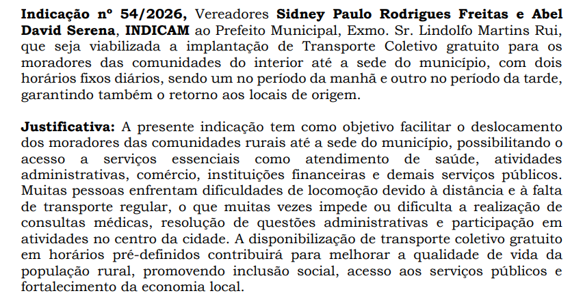 Na justificativa, Abel Serena e Sidney Freitas destacam que muitos moradores do interior enfrentam dificuldades de locomoção devido à distância e à falta de transporte regular, o que muitas vezes dificulta consultas médicas, resolução de demandas administrativas e outras atividades na sede do município.