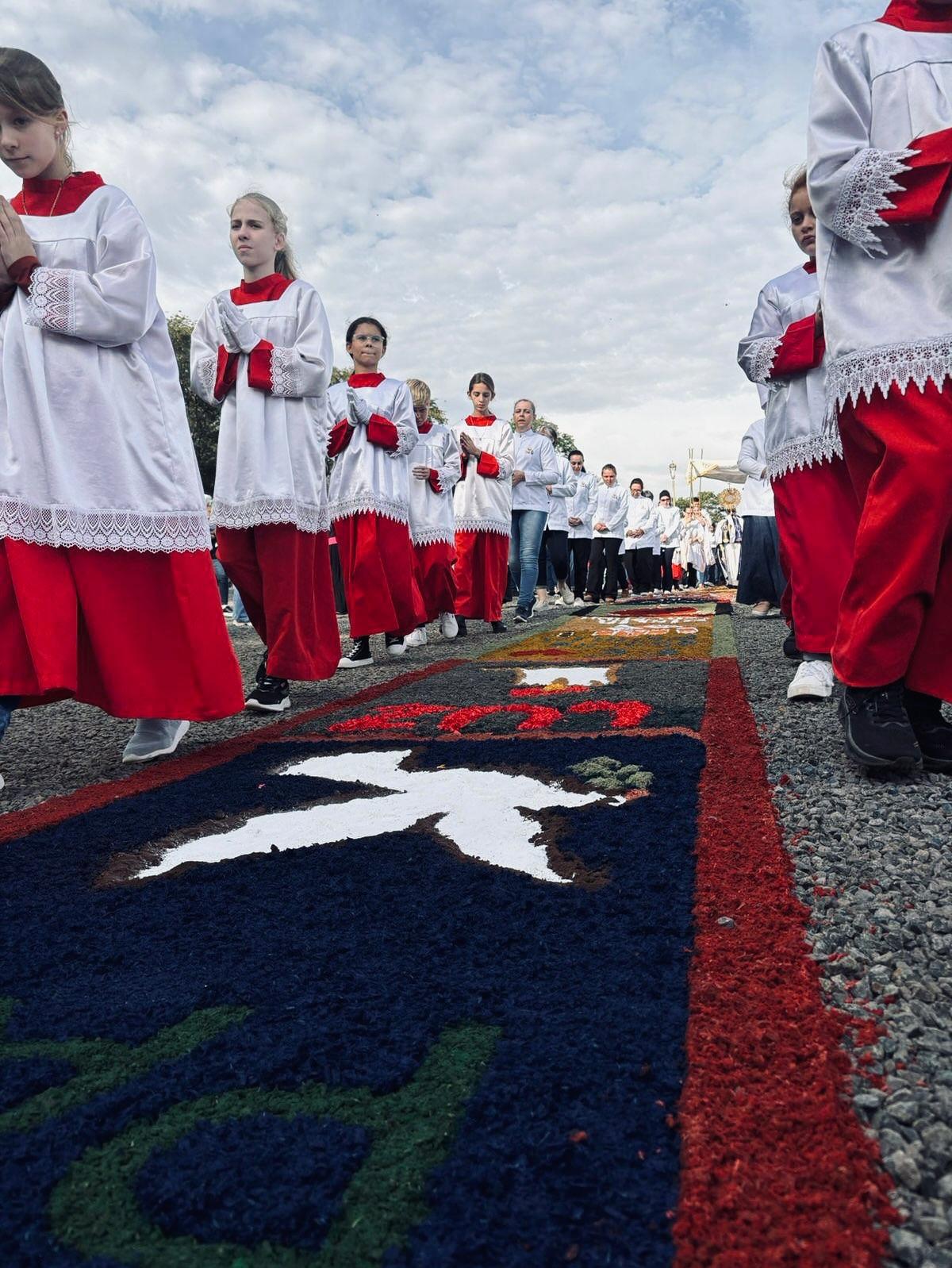 Os tapetes coloridos, cuidadosamente confeccionados por voluntários, deram um toque especial ao trajeto da procissão, unindo arte e espiritualidade. A caminhada pelas ruas foi marcada por reverência e emoção, demonstrando o fervor e a devoção dos participantes.