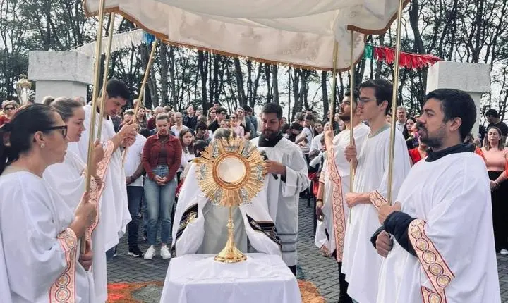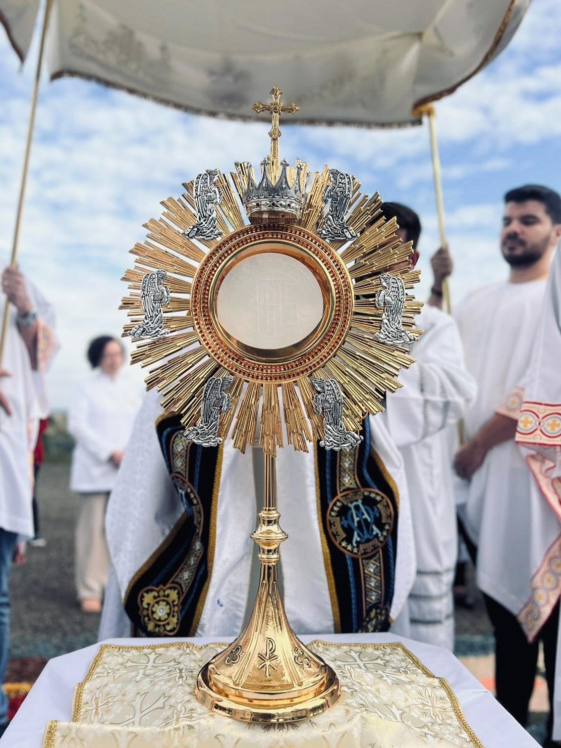 Na manhã da quinta-feira, 19 de junho, a comunidade católica de Itaipulândia viveu um momento de profunda fé e união durante a celebração de Corpus Christi 2025. A tradicional solenidade, que exalta a presença real de Jesus na Eucaristia, reuniu fiéis em oração, adoração e manifestação pública da fé. A celebração aconteceu diante da imagem de Nossa Senhora Aparecida, na comunidade do Caramuru.